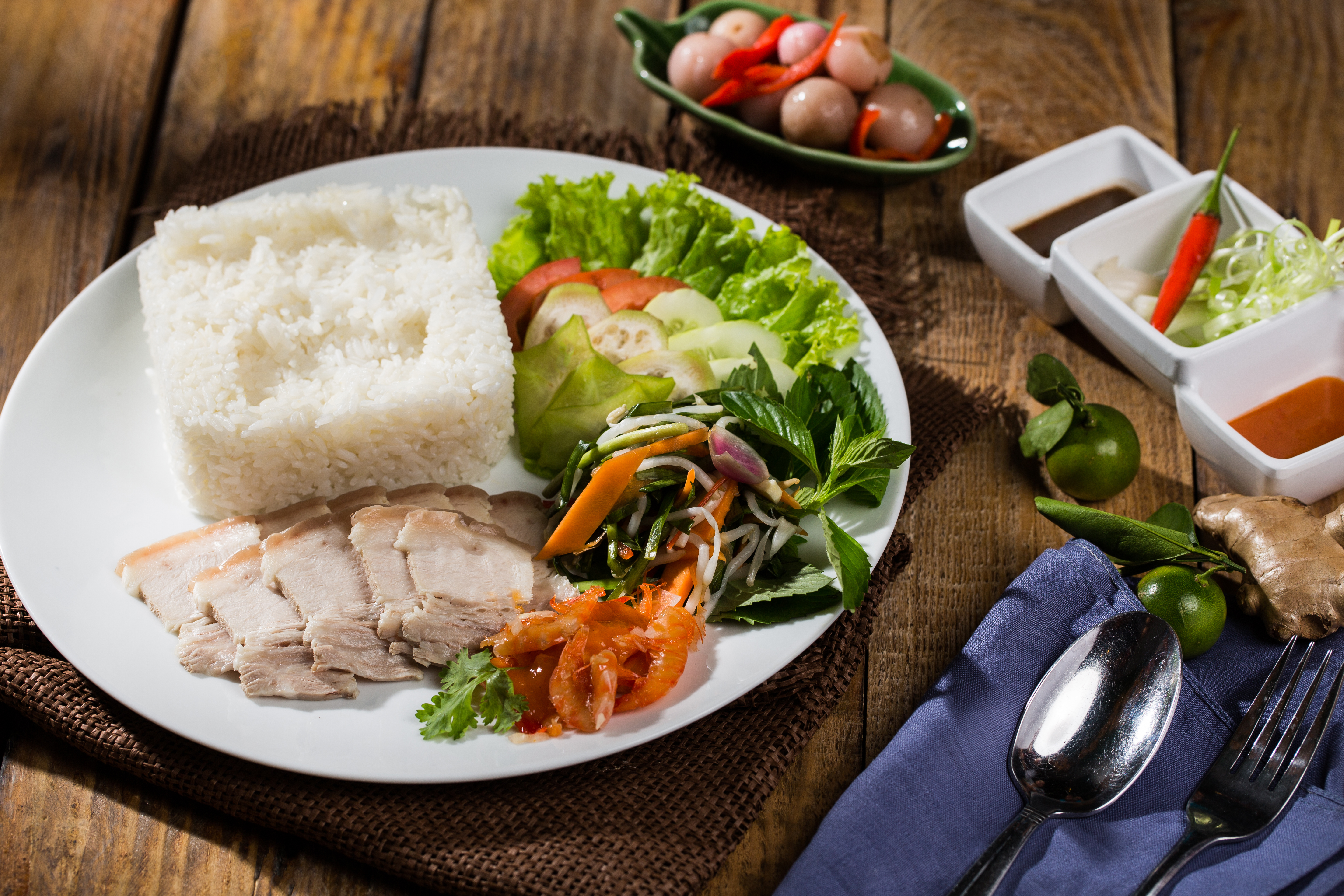 Thành phần: Cơm Thịt Luộc Mắm Huế Rau ăn kèm